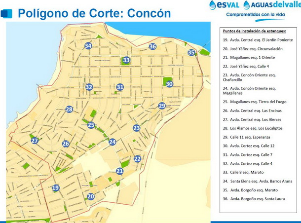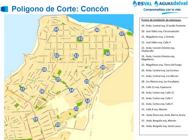Para tales efectos la empresa sanitaria Esval va a disponer puntos de instalación de estanques de agua para los vecinos de la Comuna. Esta situación se produce debido al cambio de trazado en la Red Agua Potable en el sector Los Médanos, Reñaca-Río Aconcagua, Concón.